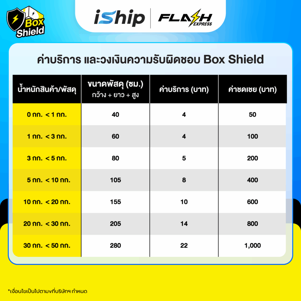 • สามารถซื้อบริการเสริม Box Shield ได้ เมื่อใช้บริการขนส่ง Flash Express และเลือกใช้โปรโมชัน Flash Pro OK และ Flash 100cm เท่านั้น